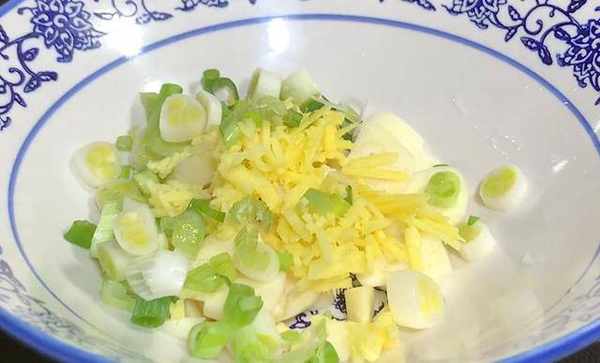 接下來,炒鍋中油熱之後,把雞蛋倒進鍋中炒成大塊,煎好之後盛出來備用。包菜醃好後用清水洗掉表面的鹽分。然後瀝幹水分備用。