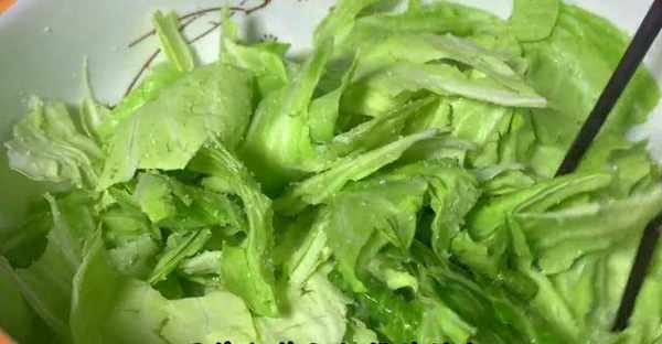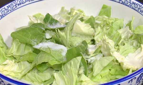 小碗中加入一勺食用鹽,一勺白糖,雞精,一勺陳醋,兩勺生抽,一勺蠔油,胡椒粉,再倒滿一小碗清水攪拌均勻。包菜醃好後,用清水洗掉表面多餘的鹽分,然後控水備用。
