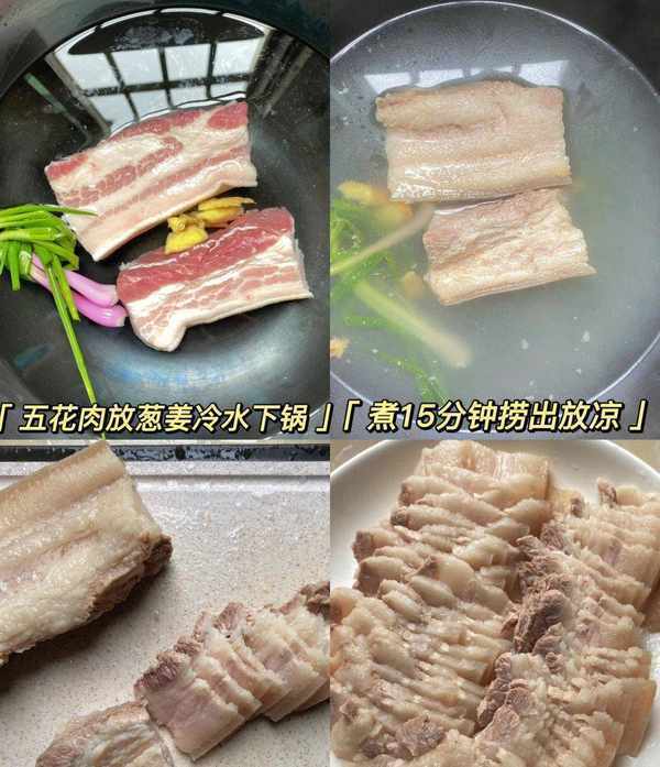 首先,需要準備好五花肉。將五花肉洗凈切成薄片,放入冷水中加入一些小蔥、薑片和料酒,開火煮沸後再煮15分鐘,撈出晾涼備用。