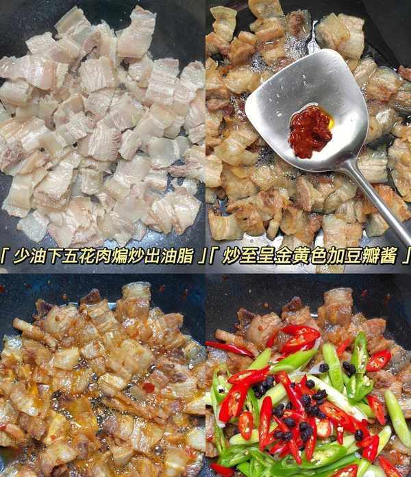 然後,將切好的五花肉放入鍋中加熱,讓肉片煎出油脂並炒至金黃色。接著加入一勺豆瓣醬,翻炒出紅油和香味。