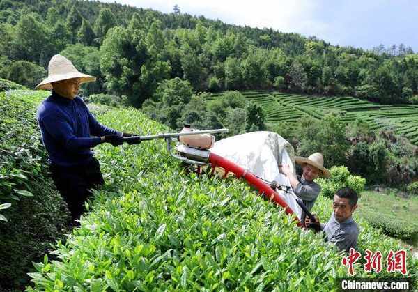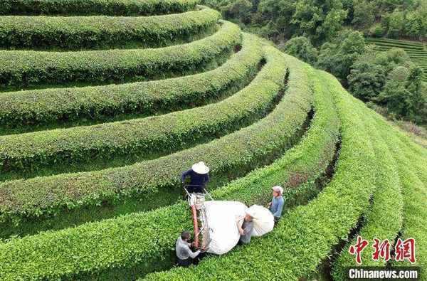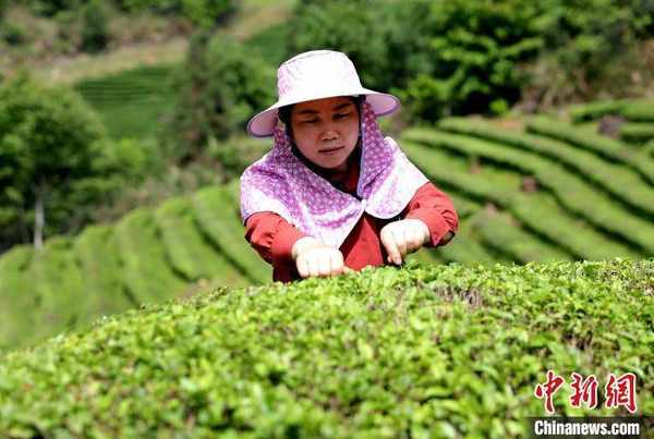 圖為茶農在茶壟間采收茶葉。 黃傑敏 攝