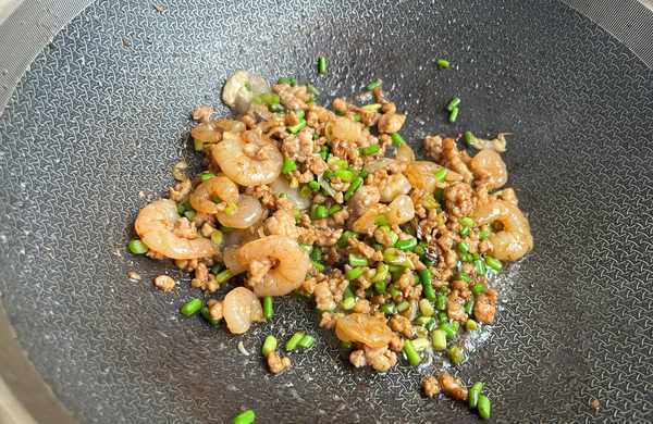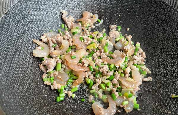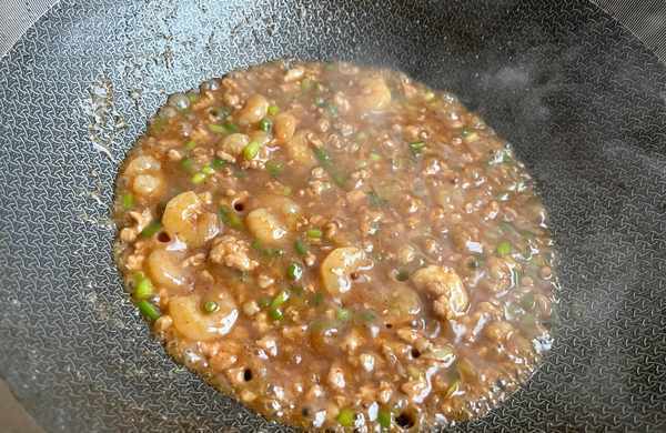 ⑧、再下入肉末。翻炒均勻。炒至肉末變色發白就可以。