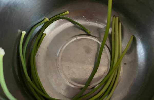 ③、把幾根蒜苔掐去頭部,清洗幹凈,切成小丁。
