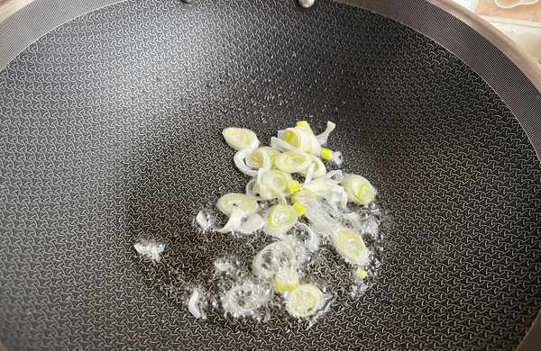 ⑦、起鍋燒油。把花生油燒熱以後,先下入蔥花,炒出香味。