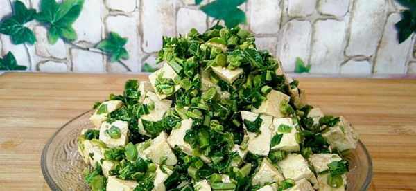 4把豆腐丁,放進香椿裡面,加入鹽,香油,拌均勻即可。調味料不要太多,隻要香油與鹽,能襯托出香椿和豆腐本來的氣質。
