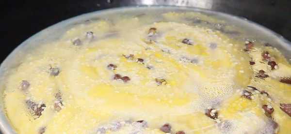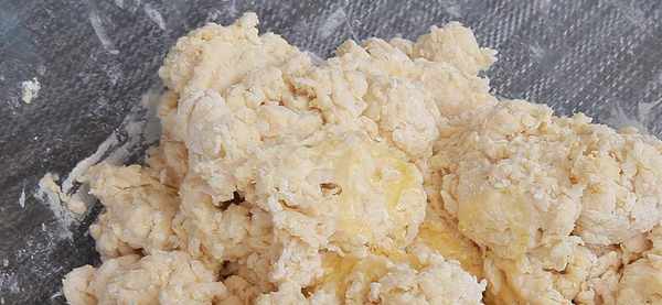 4.再用250毫升牛奶和面,一邊倒一邊攪拌,攪拌成面絮狀,再加入20克食用油或者黃油。