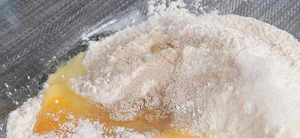 3.500克面粉放入盆中,磕入兩個雞蛋,加入5克酵母,35克白糖,攪拌均勻。