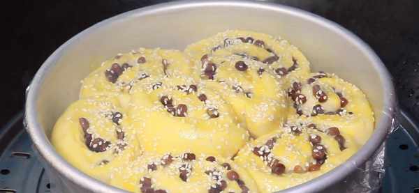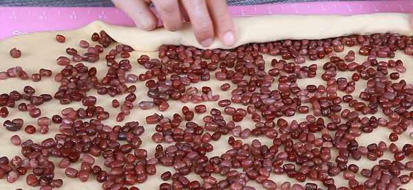 10.在表面鋪上前面的紅豆,再從一頭把它卷起來即可。
