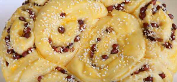 14.在表面刷上一層雞蛋液,然後撒點白芝麻進去。
