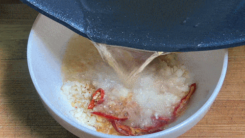 6. 將滾燙的熱油澆在上面激出香味,用勺子攪勻,加入食鹽