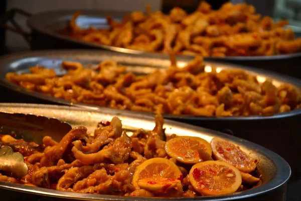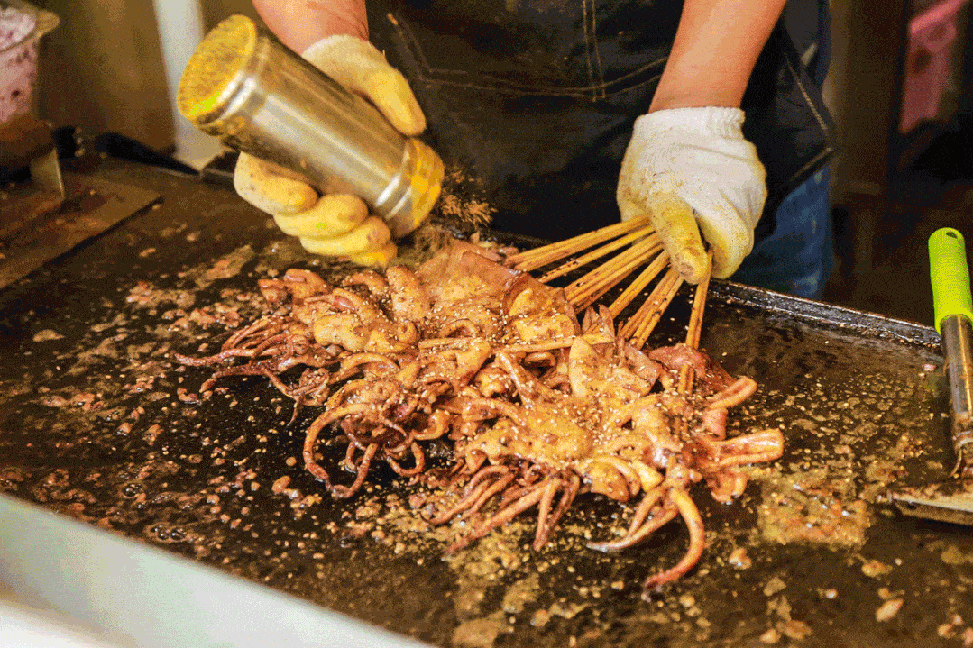 炸肉的爐灶忙碌的工作著,新鮮的魷魚擺上貨架,水晶街的人潮中流淌著人們對美食的向往。