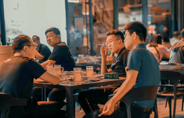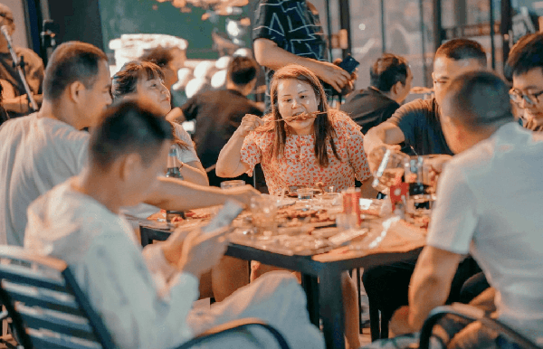 隔著老遠,就能看到地標式的淄博水晶街牌坊和地攤上坐著聊天、喝酒、吃串的人們,肆意歡笑,盡情暢飲。