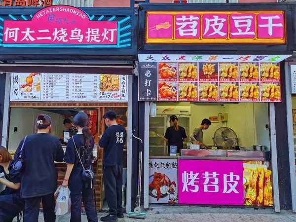 來青島想要打卡文和友同款小吃街,當然要來臺東恣兒街。閃著熒光的霓虹招牌上滿是各式各樣的小吃美食,讓人目不暇接。