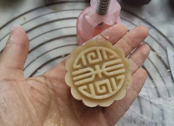 第六步:然後準備好月餅模具,撒上麵粉防粘,放入團好的月餅球。
