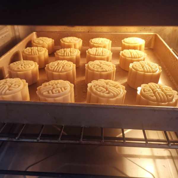 第九步:烤箱200度預熱5分鐘,放入烤盤200度烤5分鐘定型。再拿出刷上一層薄薄的蛋黃液,改成170度烤制20分鐘,月餅著色合適,就可以出爐了。