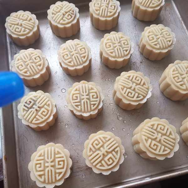 第八步:全部壓好放入烤盤中,用噴壺噴上一層清水。