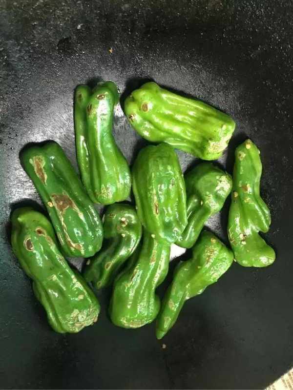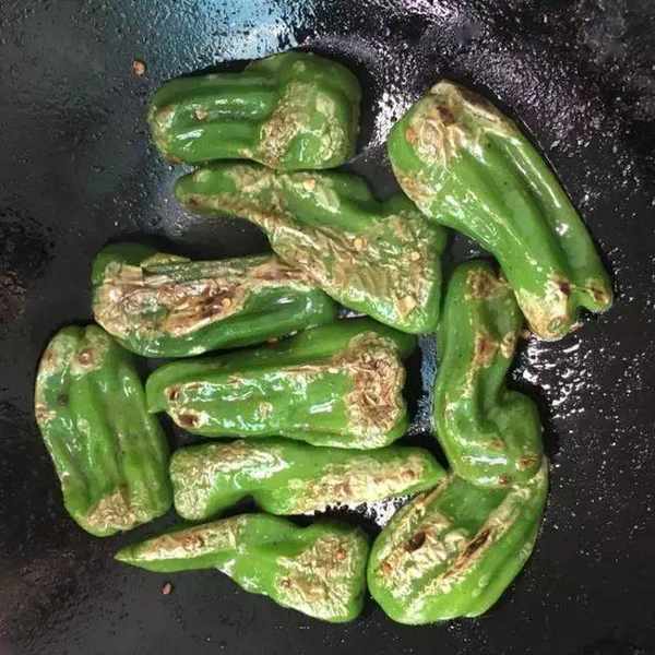 Step2 :鍋燒熱,不放油,下入切好的青椒,背面朝下,炒至微微起虎皮。
