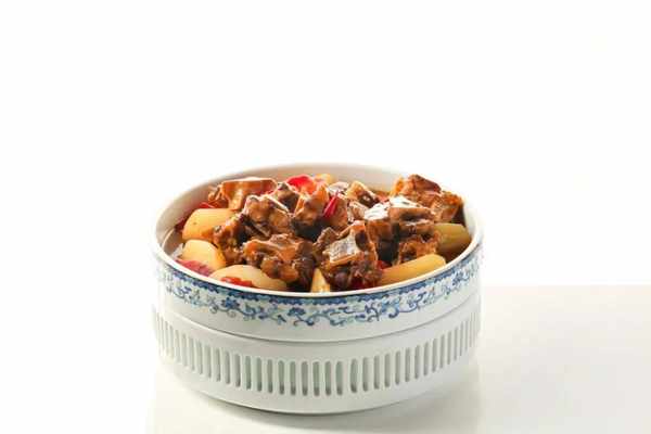 ④鍋內30克色拉油,入小米椒丁5克、薑丁10克、蒜丁10克煸炒出香味,入高湯200克、蠔油10克、東古5克、辣鮮露5克、胡椒粉2克、雞精10克、白糖5克、冰糖老抽2克,加入牛尾和蘿卜燒制入味,打薄芡出品即可。