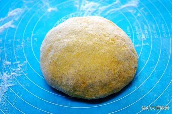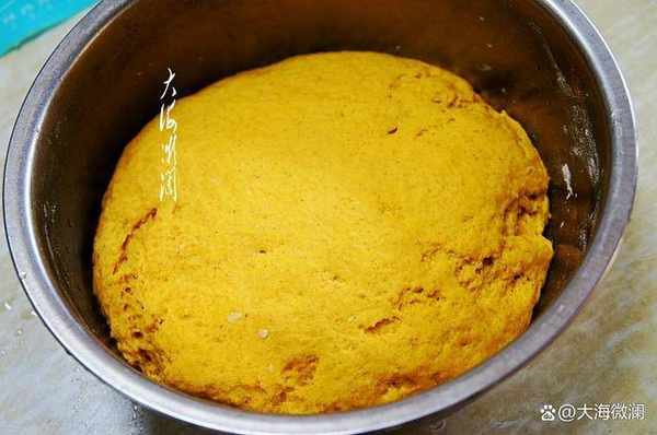 南瓜泥降溫到30度左右,加入酵母攪拌均勻後,篩入面粉揉成面團,面粉要慢慢地加,揉至光滑,蓋上保鮮膜,溫暖處餳發大約1小時左右。