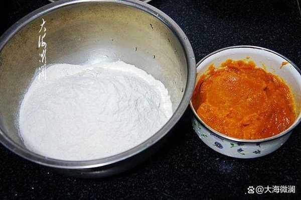 準備食材,面粉用中筋面粉就可以,南瓜去皮去瓤,切成塊上屜蒸熟,然後壓成南瓜泥。由於南瓜的品種不同,做成的南瓜泥的幹稀程度也不一樣,所以用來和面的用量也不相同。