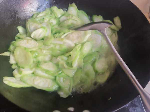 第五步:倒入絲瓜煸炒均勻,撒一點水繼續煸炒。