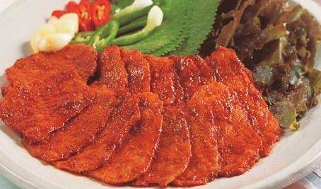 ①制作兩次熟的肉:將牛肉或豬肉在沸水中煮開,用佈包好,壓重物,冷卻後切成條。