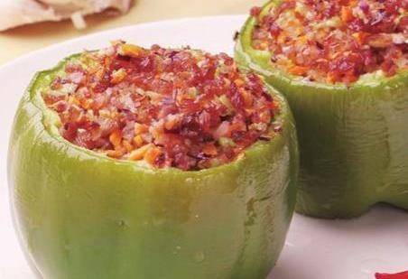 ③將醃好的培根餡倒入空心的青椒中。