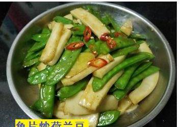 1蒜頭,幹蔥2薑片3荷蘭豆4炸魚片5先將炸魚片用蒜頭,幹蔥煎香上碟,再爆香蒜頭,幹蔥,薑片爆炒荷蘭豆,炒至開始轉翠綠後,加少少黃酒,雞粉,糖輕炒,再放入魚片,加少少水滾起後,加少少麻油,完成.