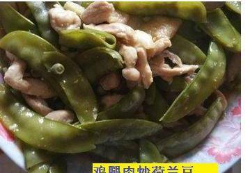 1先把雞腿肉洗凈切條狀備用,再用油和生粉去醃大約10-15分鐘備用2先放油,鹽去炒荷蘭豆至軟身炒起備用3用油去爆香蒜頭後加雞腿肉炒大約5分鐘後加豉油4最後再加回荷蘭豆炒勻即可上碟