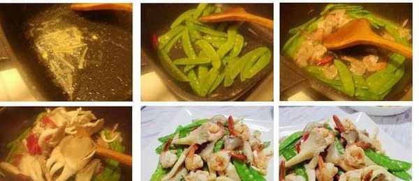 材料:蝦子酌量、荷蘭豆1包、秀珍菇1包、辣椒、ˊ薑絲、ˊ酌量調味:米酒1大匙、鮮味炒手1茶匙、水少許第二步做法步驟
