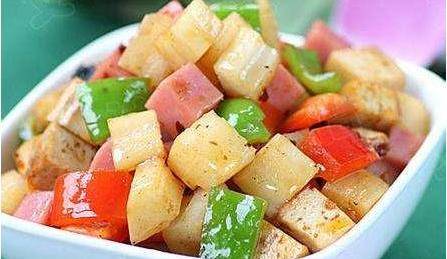 1.青紅椒去蒂去籽洗凈後切成丁。火腿切丁。豆腐幹切丁。蓮藕去皮洗凈後切丁。