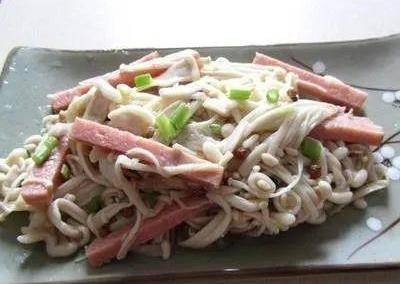 材料:熟火腿肉、金針菇、鹽、雞精、白砂糖、香油。