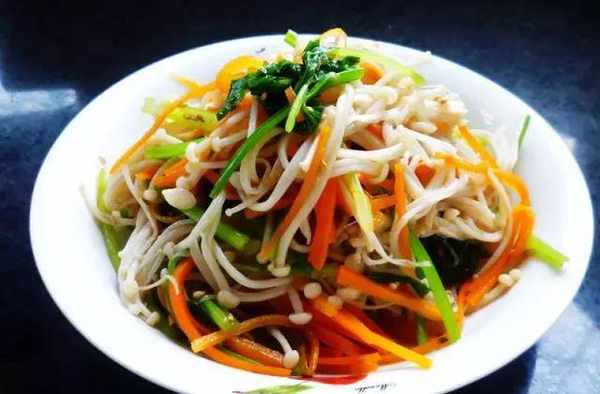 材料:金針菇、黃瓜、青紅椒、鹽、味精、芥末油、香油、生抽、芹菜絲、香醋。