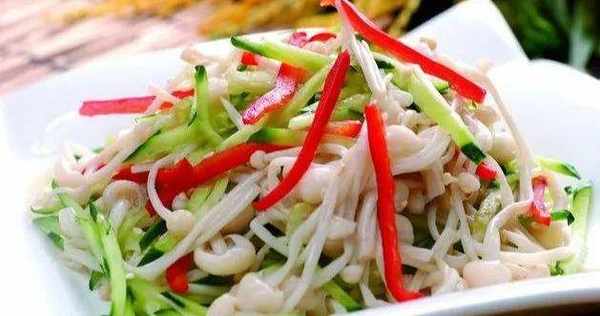 材料:金針菇、黃瓜、紅柿子椒、鹽、白糖、醋、味精、蒜末、薑米、蔥絲。