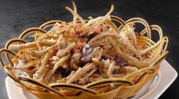1. 將粉絲用溫水泡軟,放入熱油中炸成盞。