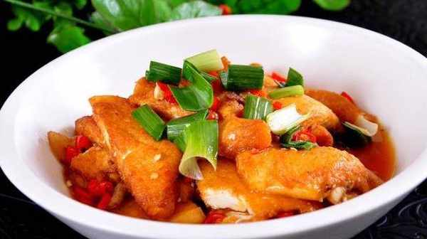3、炒鍋置中火上,下少許油燒熱,將胡椒粉、白糖、豆腐一同入鍋,燒沸後移至小火燜制,待汁幹時,下味精、紅油、蒜苗節,起鍋時將麻油,澆在豆腐上即可。