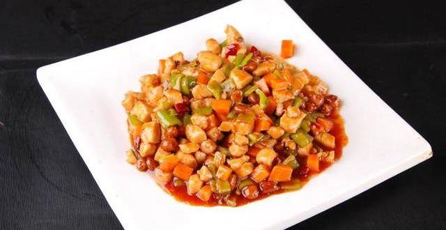 3、炒鍋置旺火上,放油燒至6成油溫下幹辣椒段、花椒,炸至棕紅色,放入雞丁炒散籽;加薑、蒜片、蔥丁炒出香味後,待雞丁斷生,烹入滋汁,收汁亮油,加入花生,翻炒均勻,起鍋裝盤即可。