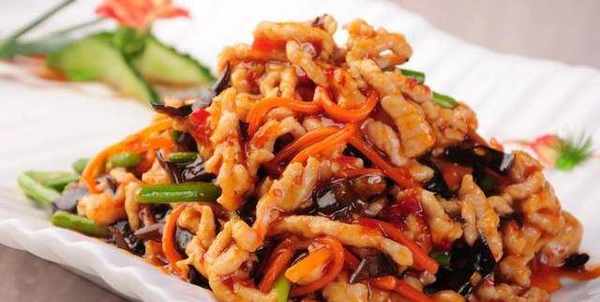 3、炒鍋置旺火上,放油燒至6成油溫,放入肉絲炒散籽,加泡椒辣末、薑、蒜炒出香味,再入木耳、蘭片絲、蔥花炒勻,烹入滋汁,待收汁亮油起鍋裝盤即可。
