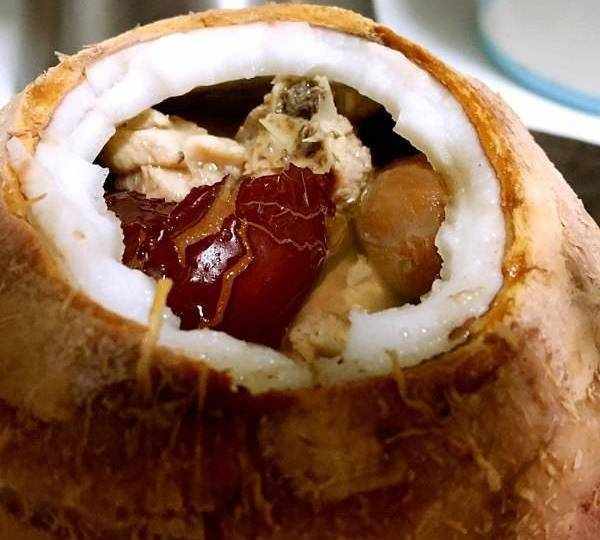 椰子雞湯做法就比較復雜瞭,需要準備的原材料也比較多,先小火熬制雞肉,加入紅棗、枸杞,再把椰子榨稱椰汁,濾幹椰子渣,倒入雞湯裡面。