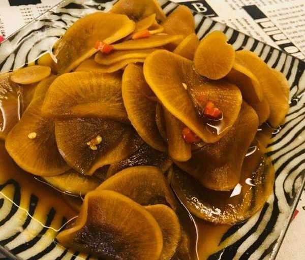 糖醋蘿卜:白蘿卜切片備用,白糖,白醋,生抽全部放入鍋裡大火燒開,放入切好的蘿卜小火煮15分鐘,最後放入辣椒在煮5分鐘,完成,裝入樂扣保鮮盒放入冰箱冷藏,隨時吃隨時取,隔夜更入味!