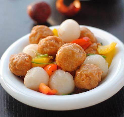1.將雞腿切成片,加鹽、味精、生料、粉和水20分鐘,然後滑入4個滾珠中,放入熱油中;