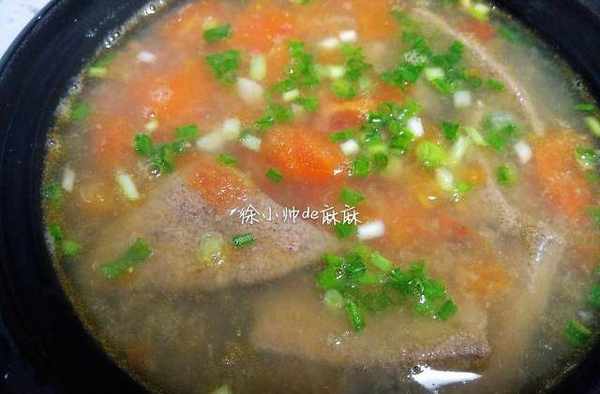 3、將豬肝一起倒進西紅柿湯內,稍微煮2分鐘,裝碗,撒上香蔥末即可。