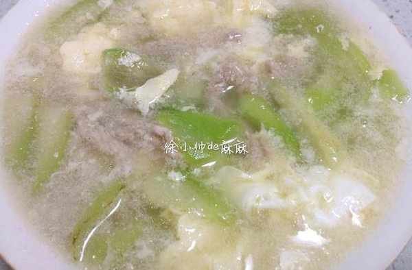 3、倒入適量開水,煮沸,將勾芡好的肉絲放進鍋內,稍微煮2分鐘,肉絲就焯熟瞭。將打好的雞蛋液倒入絲瓜湯中,煮到雞蛋花飄起來。最後關火,放鹽和黑胡椒粉調味即可。
