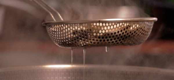 2、開水鍋中加入半勺鹽、幾滴食用油拌勻,倒入香菇片,焯水至斷生,撈出瀝幹水分;