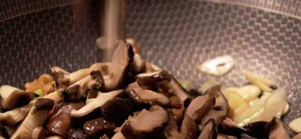 4、重新起鍋倒入少許食用油,油熱下入蔥薑蒜片炒香,然後倒入處理好的肉片和香菇片;