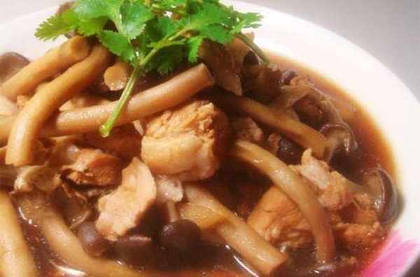 五花肉、茶樹菇、蔥、薑、料酒、醬油、白糖、鹽、八角、桂皮、花生油。