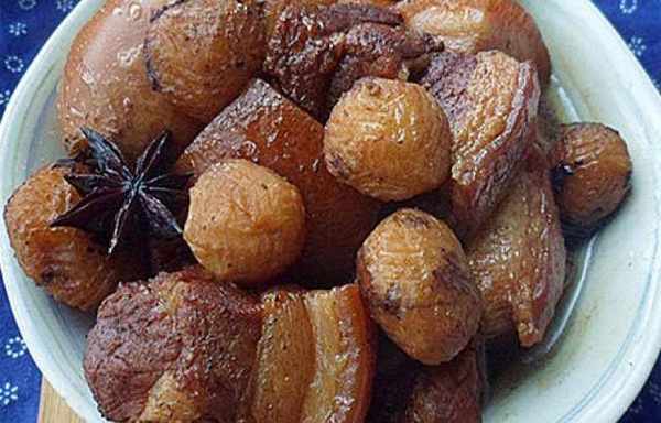 五花肉、栗子、雞蛋、料酒、醬油、鹽、蔥、薑、白糖、八角。