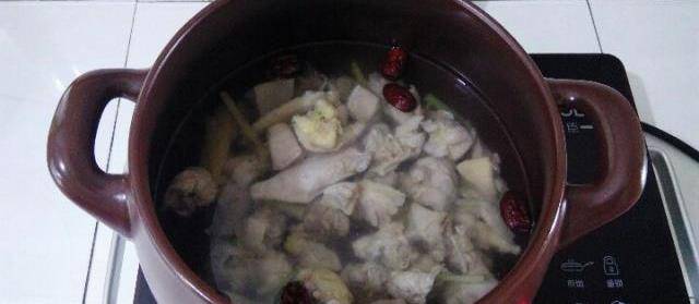 3.接著把處理好的雞塊放入湯煲裡,放入薑片紅棗和料酒,一次性倒入足夠的清水。大火燒開後,改小鍋慢慢燉制20分鐘: