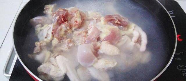 2.鍋裡倒入冷水,把剁好的雞塊放入,焯水3分鐘,把雞肉裡面的血水分解出來後,撈出清洗幹凈,瀝幹水分待用: