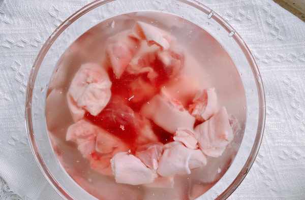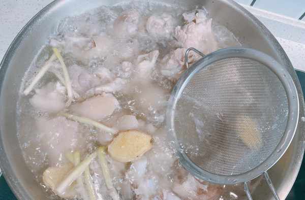 4、豬蹄浸泡好之後,再次清洗幹凈,冷水下鍋,加薑片、蔥段、料酒去腥,大火煮開之後轉小火,撇去表面的浮沫,焯水能很好地減少豬蹄中的血沫殘留,減少腥味。轉到浮沫明顯變少,撈出來放在熱水中,清洗幹凈,瀝幹水分備用;